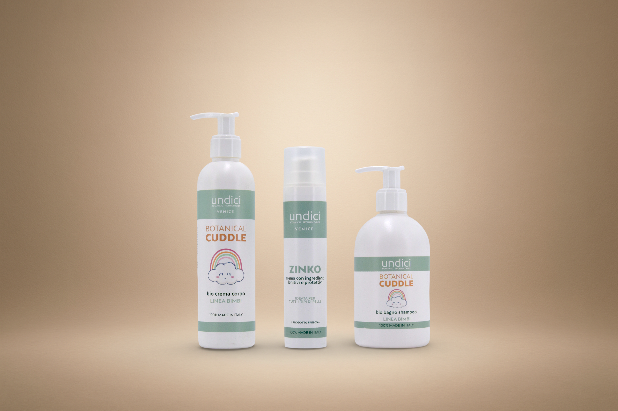 Con ingredienti biologici, estratti lenitivi e attivi fisiologici come l’acido lattico e l’ossido di zinco, i trattamenti Undici per bambini donano comfort, morbidezza e sicurezza, nel pieno rispetto della pelle e della sua crescita.